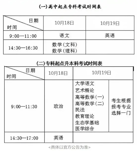 所有統考科目每科試題滿分均為150分。高起專統考科目每科考試時間為120分鐘,專升本每科考試時間為150分鐘。具體時間如下: