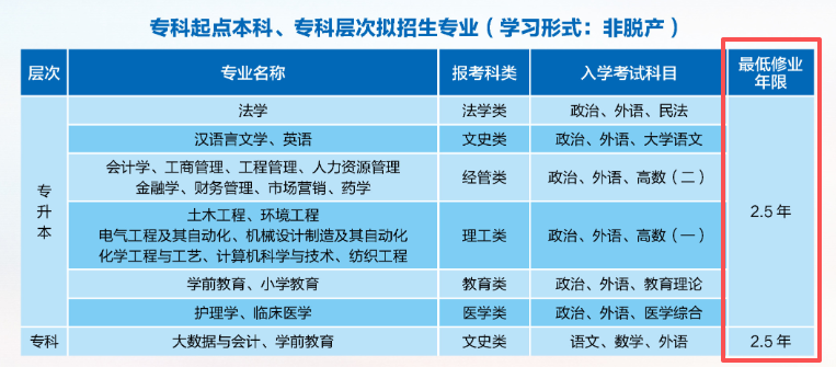(1)成人高考不必多說,學制固定,專升本層次2.5年(部分院校和特殊專業需要3年)。通常情況下,只要積極配合學習,學制期滿就能畢業拿證。如果不信的話,具體的學制大家也可以在學校官網上查看。