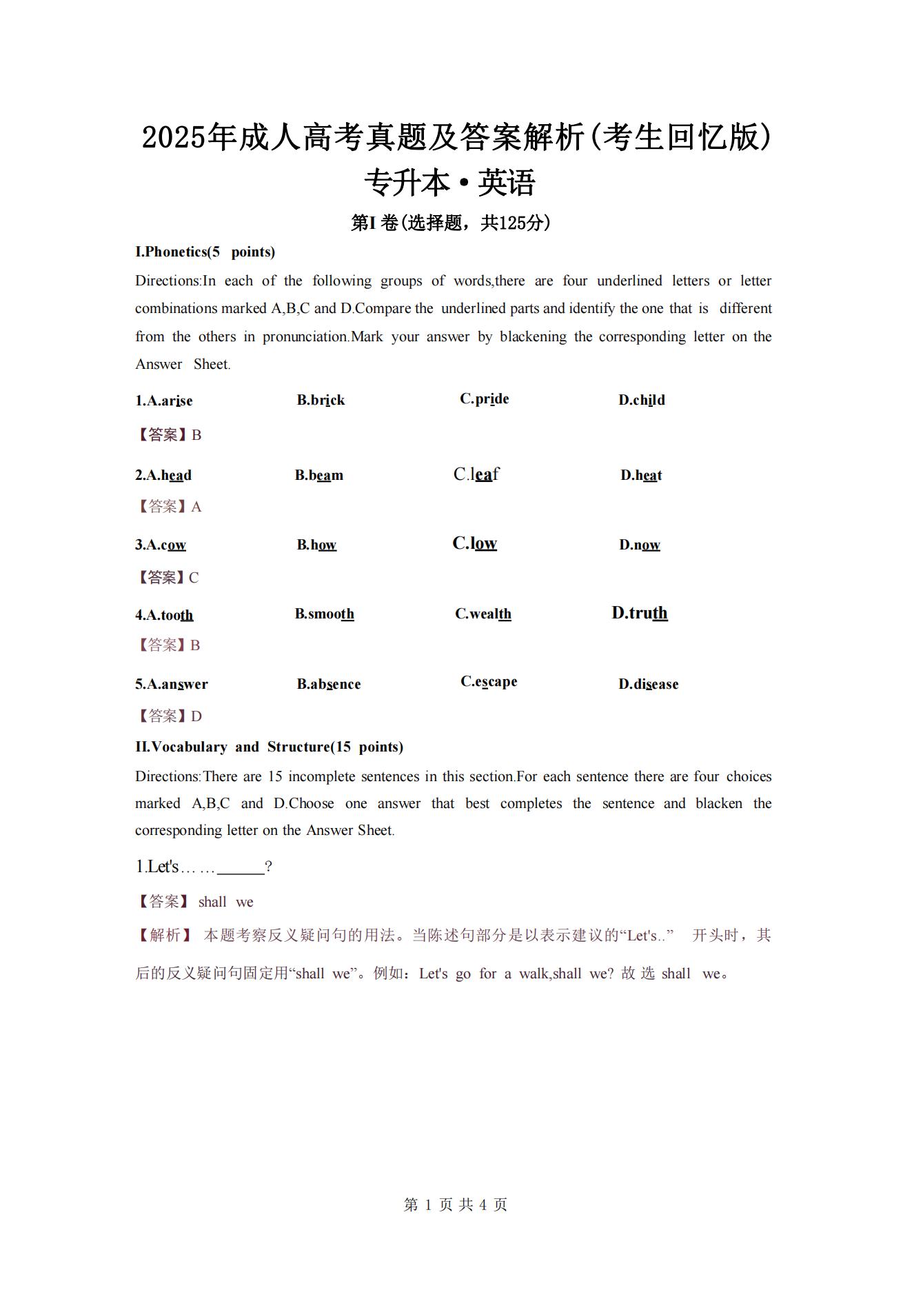 2025年成人高考專升本英語真題及解析(考生回憶版)