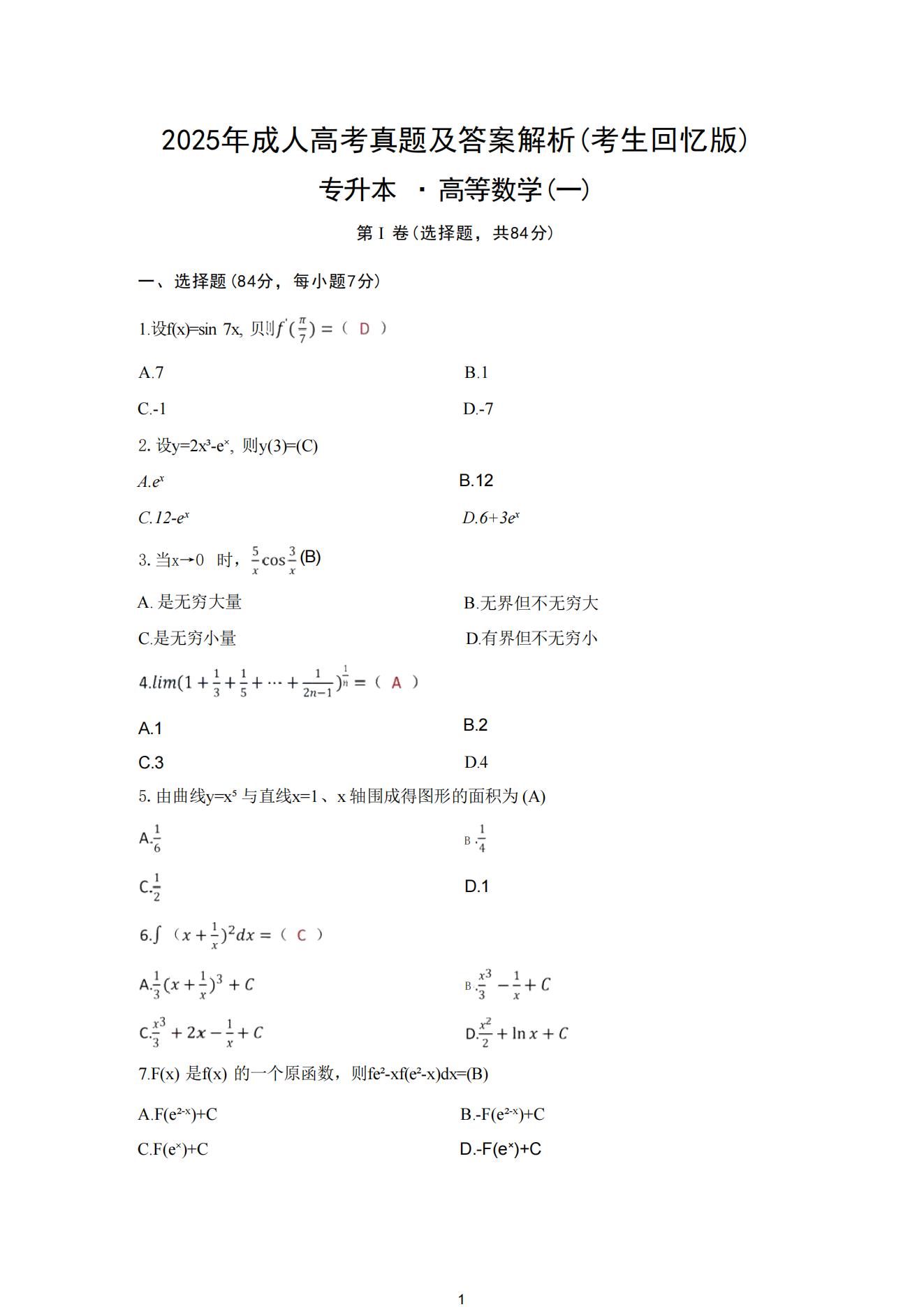 2025年成人高考專升本高等數學一真題及解析(考生回憶版)