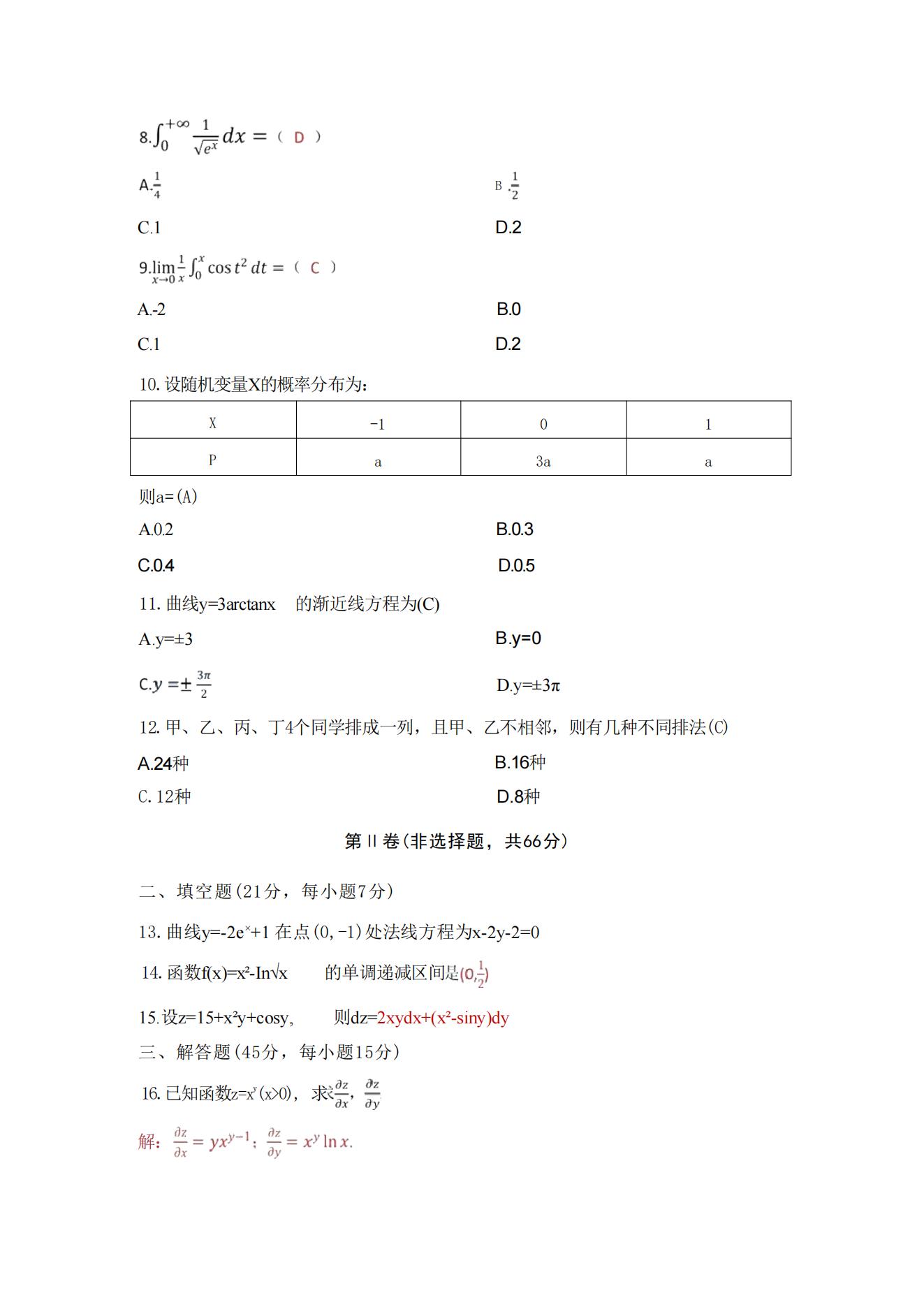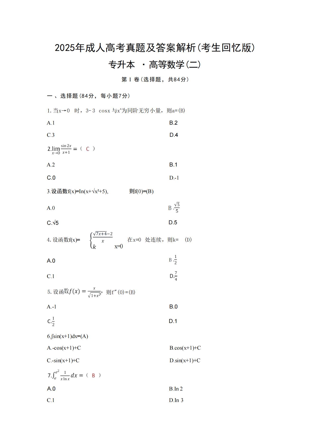 2025年成人高考專升本高等數學二真題及解析(考生回憶版)